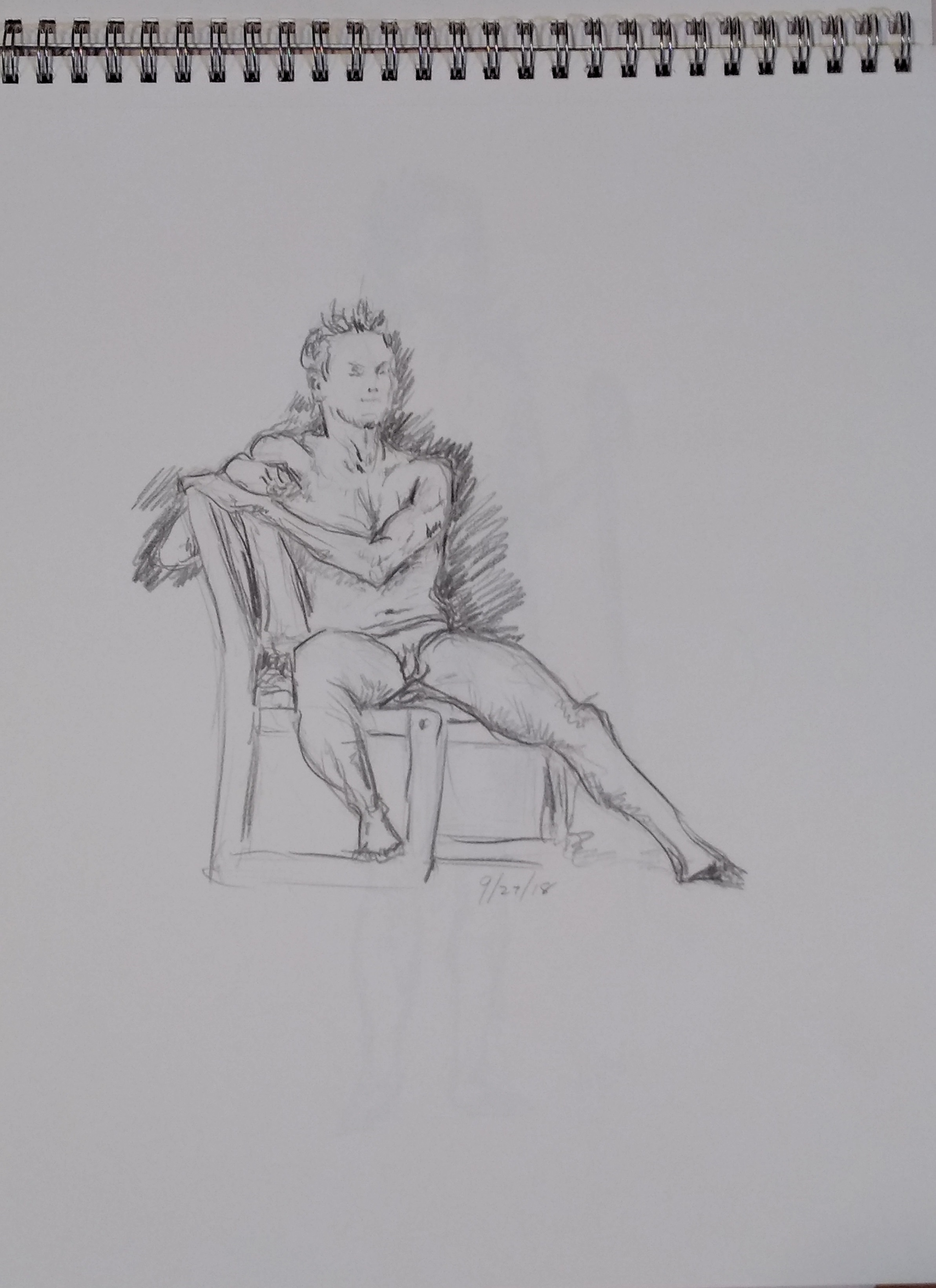 We had a good model at the Sept 27th Art Works Eagan figure drawing session. Nice young man, very enthusiastic about doing a good job for us. We started again with 30 second poses. I am working here on an 18 X 24 newsprint pad, just trying to get the gestures. 30 seconds goes fast: